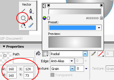Com a Ellipse Tool,crie uma esfera,segurando Shif+Alt,do tamanho como imagem abaixo, e aplique Radial cinza com essas configurações: